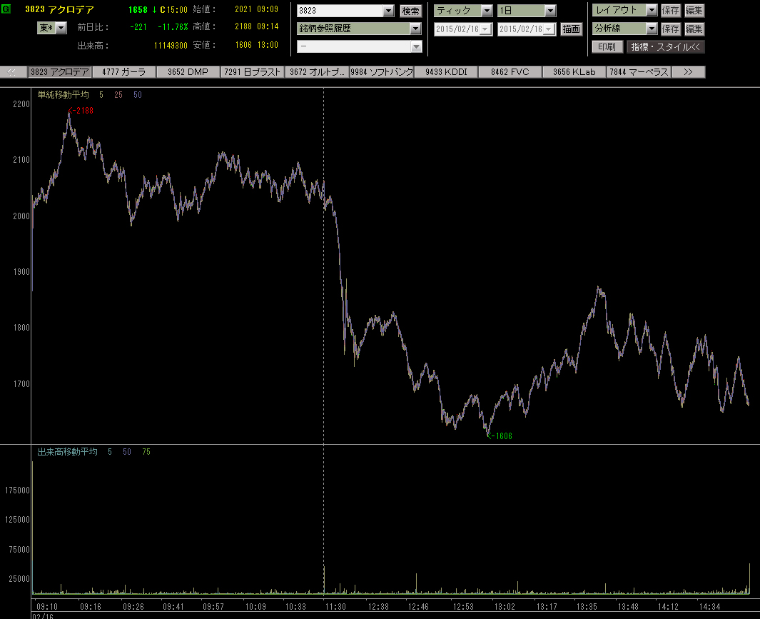 トレードしたのが、アクロディアの12時30分過ぎの2000円台から1600円までの上から下まで-400ティックの交通事故型の暴落にINしてしまい、一時期含み損が-20万まで膨れ上がった。交通事故型だったら-10万くらいまでは許容範囲内だと考えていたんですけど、まさか倍まで膨れ上がるとは思わなかった。